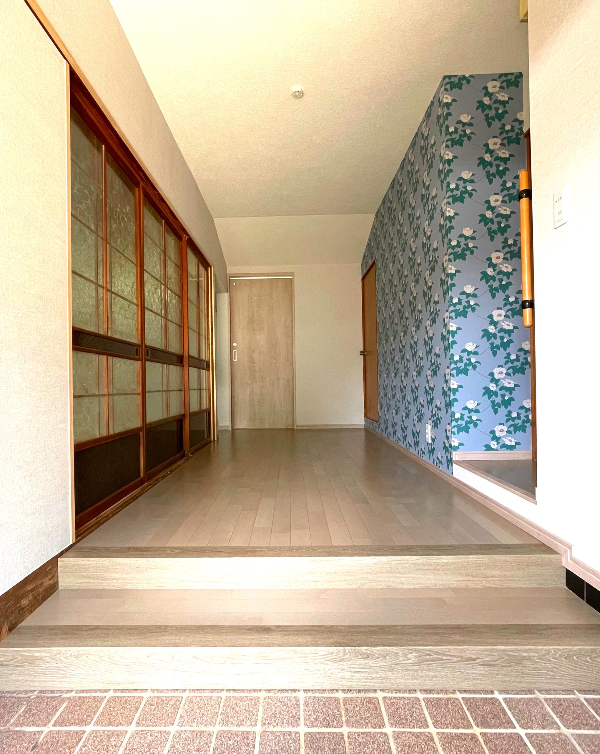 玄関ホールは、お客様からは綺麗にされたいということ以外、特にご要望はありませんでしたので、こちらから気がついたことをお伝えしました。50代・60代からのリフォーム&リノベは、高齢になった時に安心して生活できるよう、備えておくプランをご提案するよう心がけています。高齢者に優しい住まいは、小さなお子さんにも、ペットにも優しいということ。結局は、ご家族全員が安心して暮らしていただける家になります。気持ちが明るくなる、心が元気になる、を意識して壁紙を選定しました。